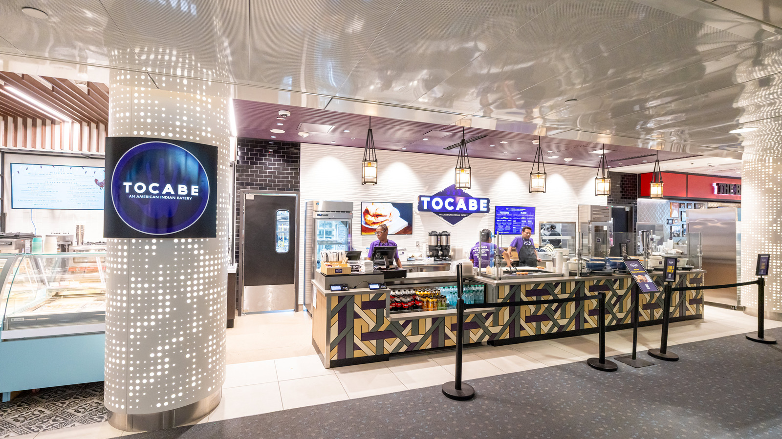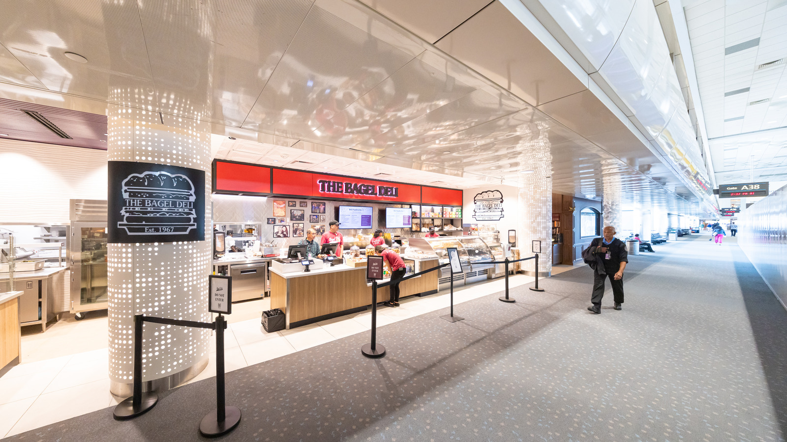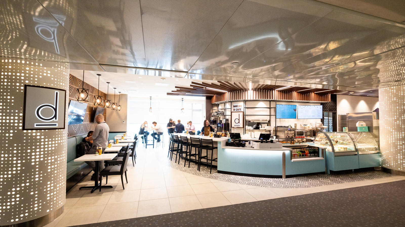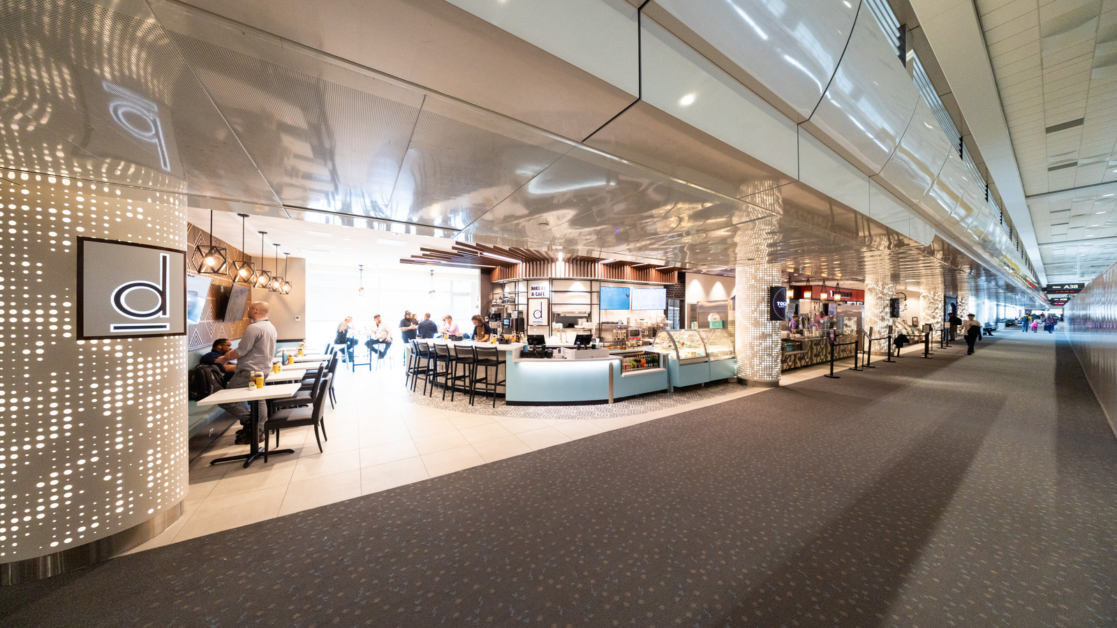 At Denver International Airport’s Marketplace Concourse A near gate A38, five MOZCC100 Series round column covers were installed at the entrances near Tocabe, The Bagel Deli, D Bar, and the Williams & Graham restaurants. Each column cover measures 36 inches in diameter and 8 feet 6 inches tall, fabricated in three sections of .125″ aluminum with vertical butt joints and a 6-inch recessed base in #4 stainless steel. The design features Moz’s Twinkle laser-cut pattern and a Snow powder-coated interior finish, offering a clean, modern look that enhances the terminal’s architecture.