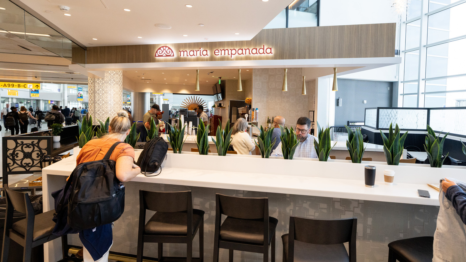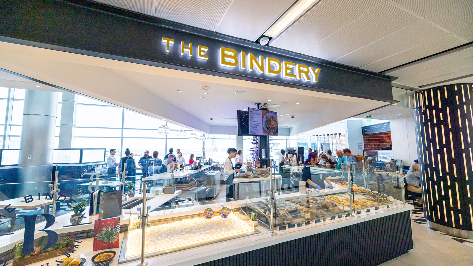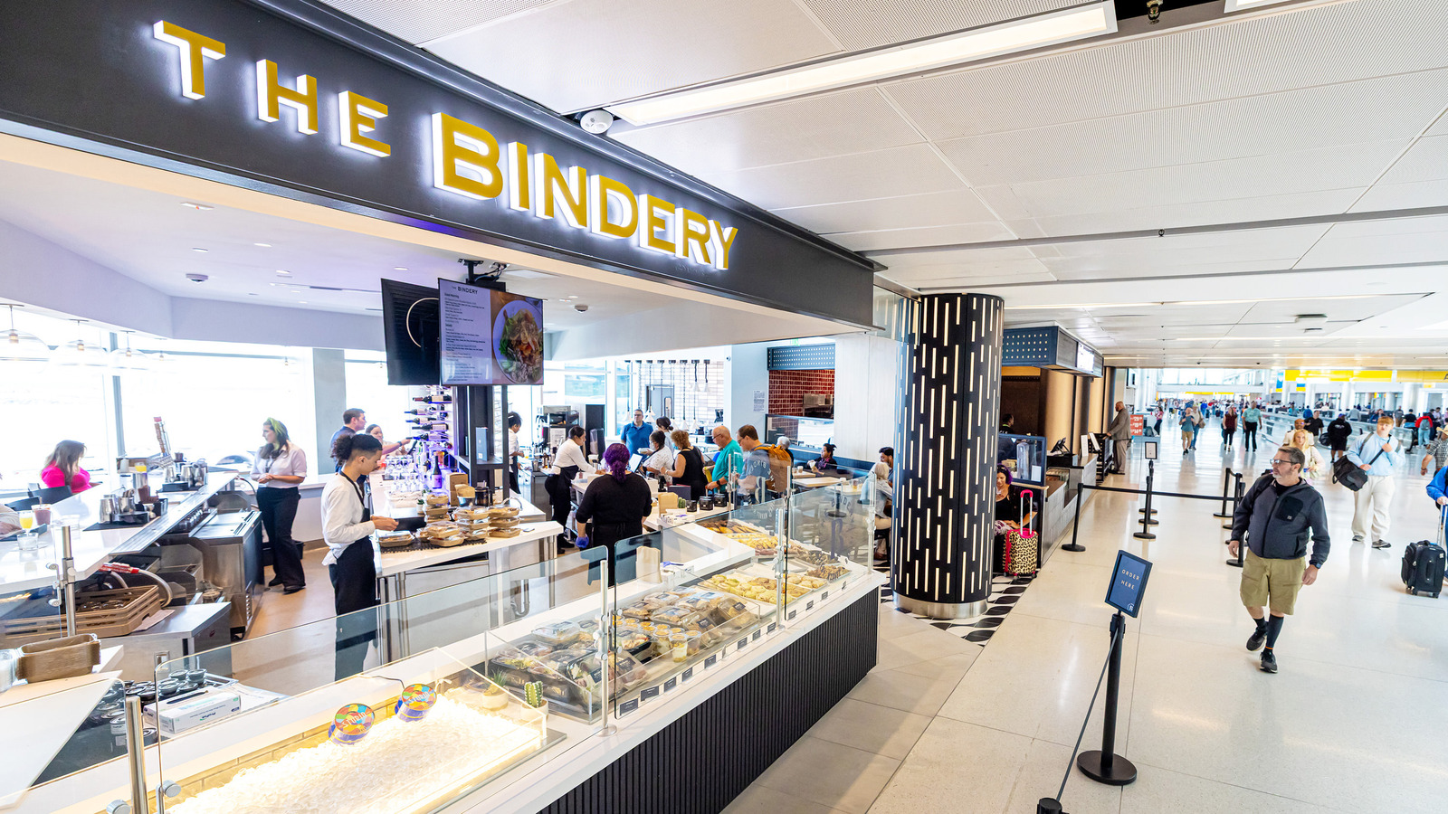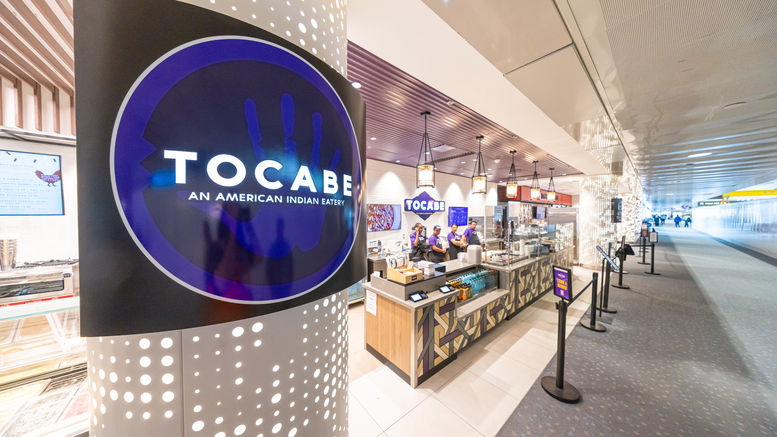 At Denver International Airport’s Marketplace Concourse A near gate A38, five MOZCC100 Series round column covers were installed at the entrances near Tocabe, The Bagel Deli, D Bar, and the Williams & Graham restaurants. Each column cover measures 36 inches in diameter and 8 feet 6 inches tall, fabricated in three sections of .125″ aluminum with vertical butt joints and a 6-inch recessed base in #4 stainless steel. The design features Moz’s Twinkle laser-cut pattern and a Snow powder-coated interior finish, offering a clean, modern look that enhances the terminal’s architecture.