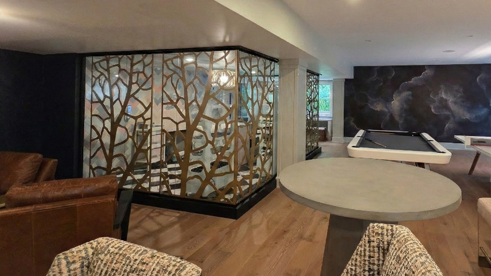 Moz Designs contributed a series of custom laser-cut metal panels that help define the greenhouse’s layered atmosphere of light and texture. Installed along exterior-facing glass, the panels filter natural light while introducing an organic visual element that reinforces the project’s connection to nature.