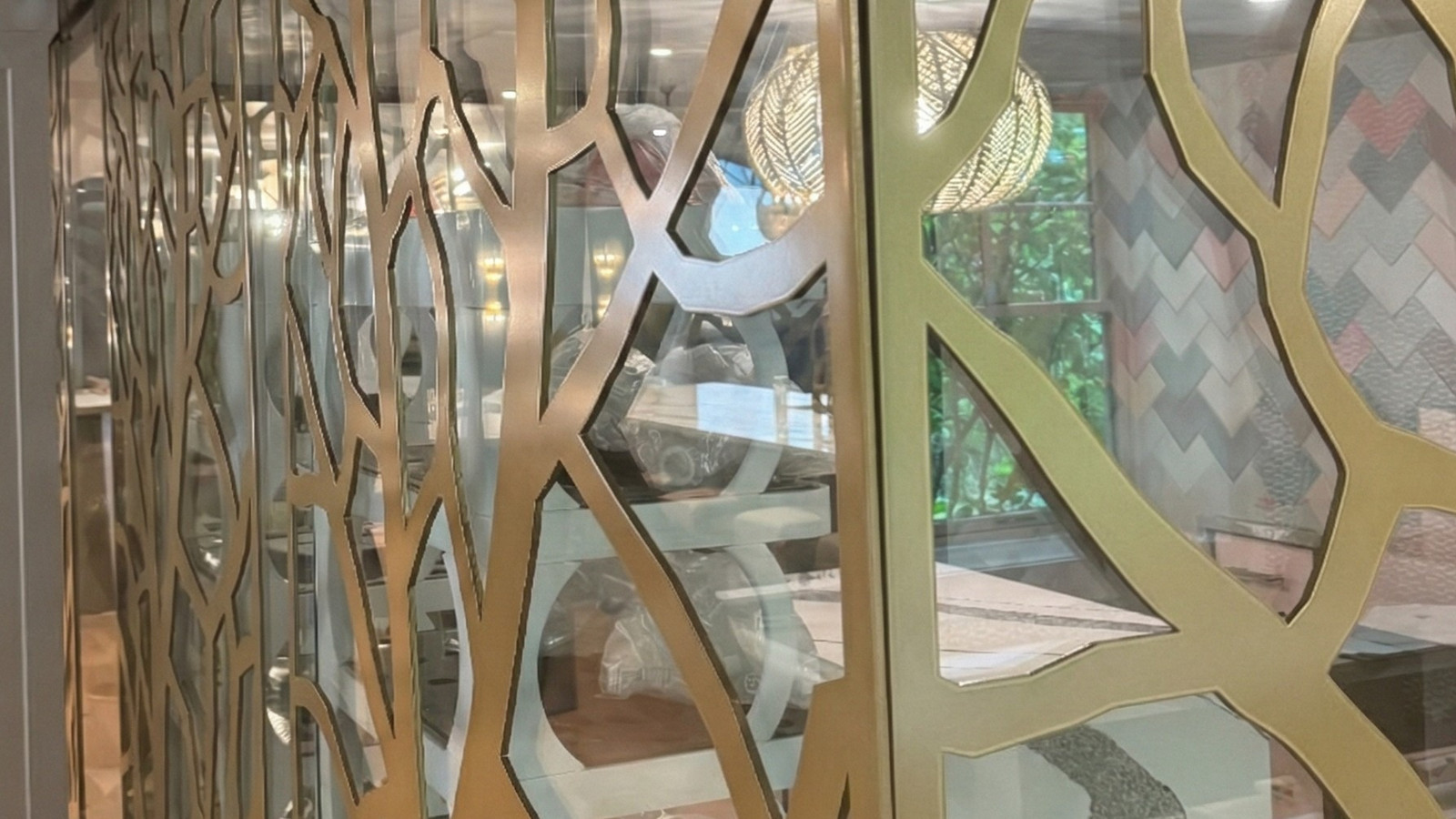 Fabricated from 4′ × 8′ aluminum sheets with the Tree pattern from the Moz Laser Cut Collection, the panels feature a Gold Metallic Powder Coat finish on both sides. The six custom panels create a sculptural screen that softens incoming light and enhances the greenhouse’s immersive design environment. In total, 192 square feet of Moz laser-cut panels were incorporated into the project.