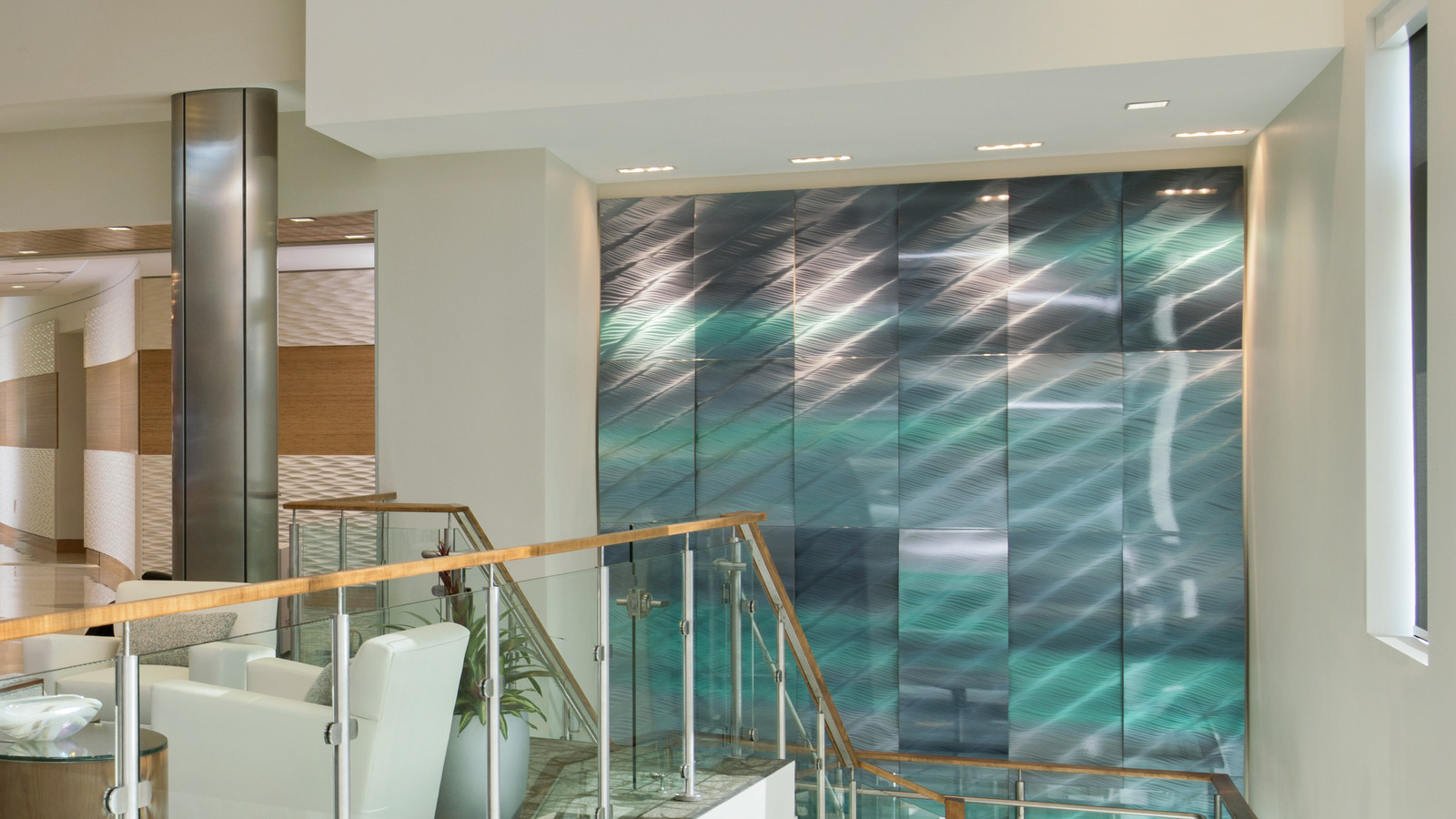 The installed product is the Móz Tides Ocean Waves Wall Panel System, configured in a vertical orientation. The design features Moz Blendz 418 Ripples Gloss material, delivering a dynamic, reflective surface.