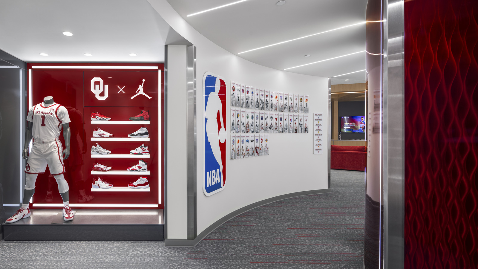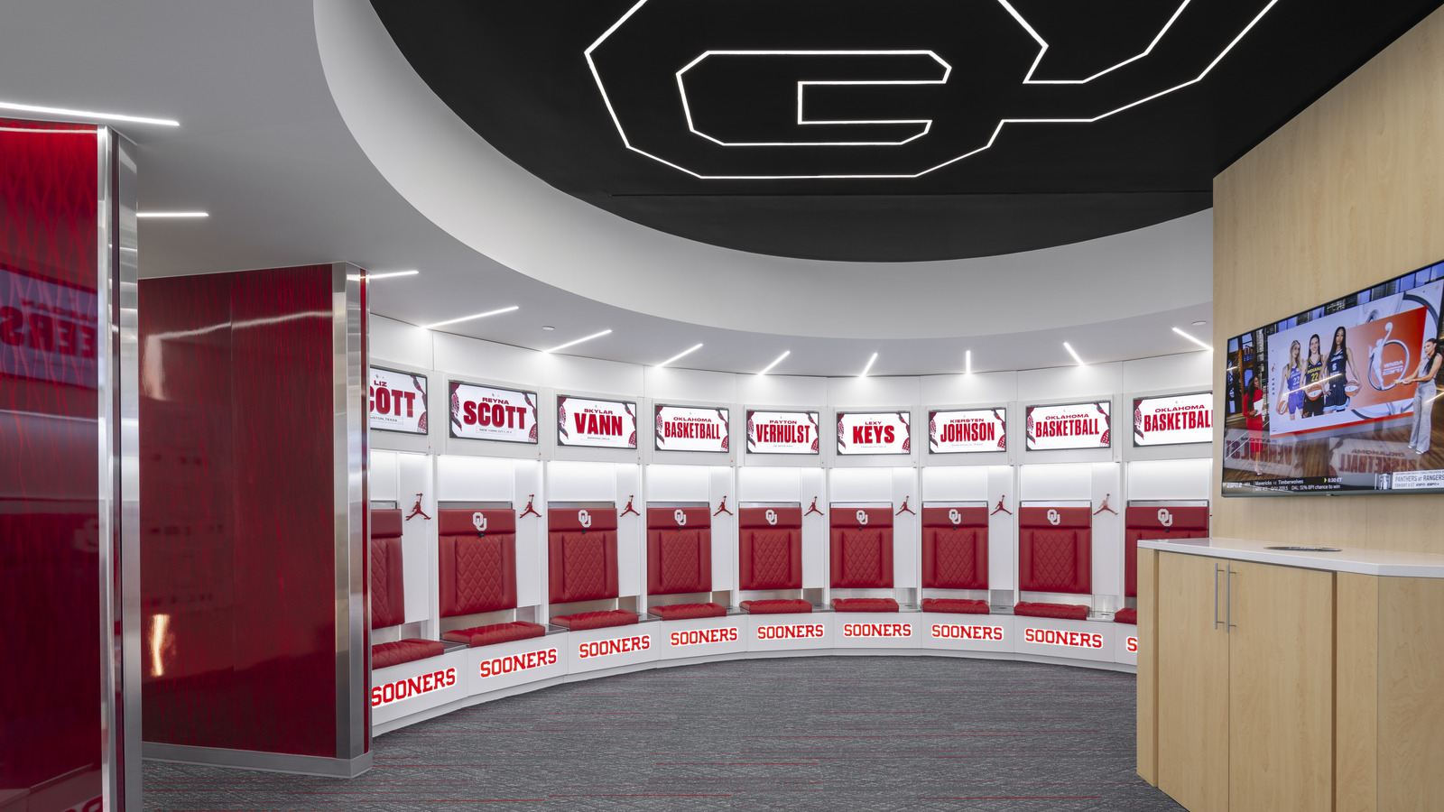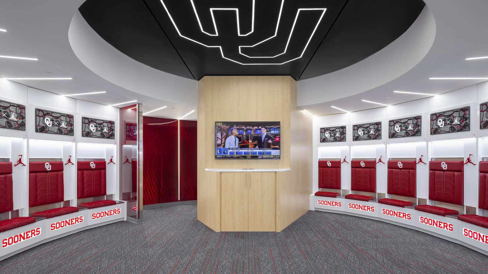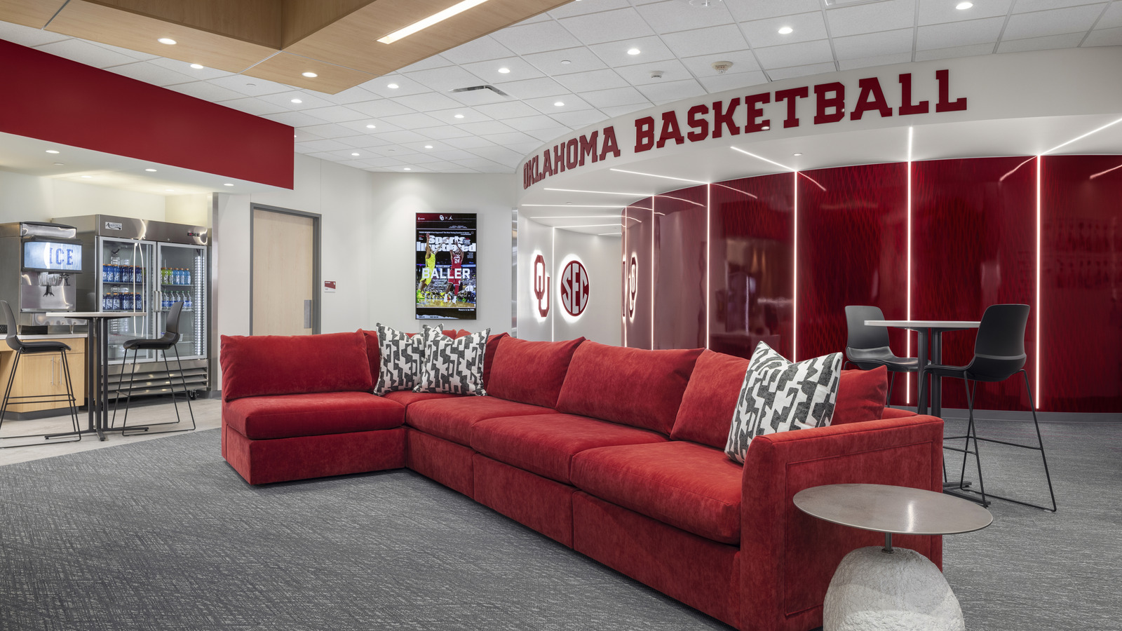 The University of Oklahoma Basketball Team Suites at Lloyd Noble Center in Norman, Oklahoma were recently renovated to enhance the experience for the university’s men’s and women’s basketball programs. Designed by Studio Architecture (Oklahoma City, OK), the project focused on creating a refined, high-impact locker room environment that celebrates school spirit while elevating the space with modern materials and lighting.