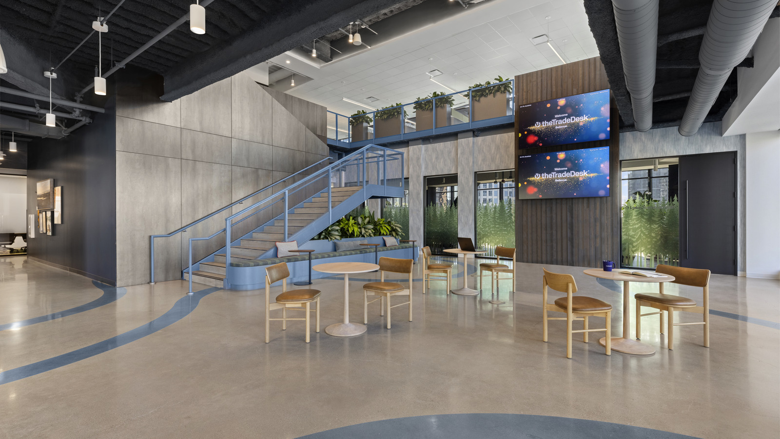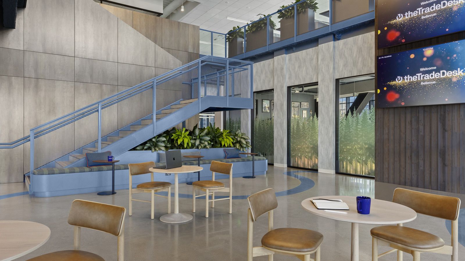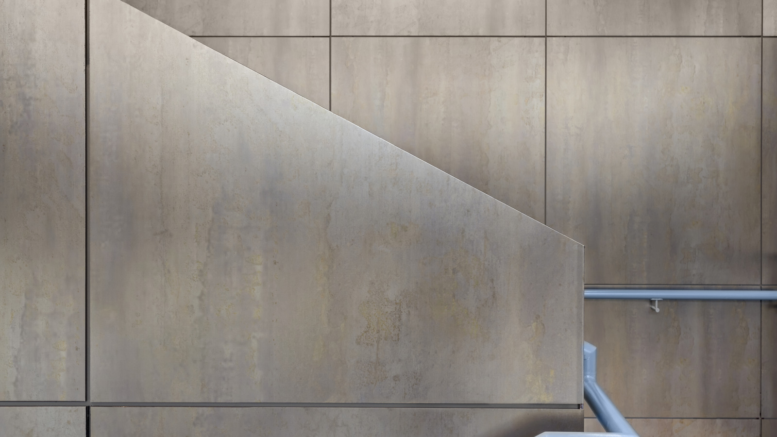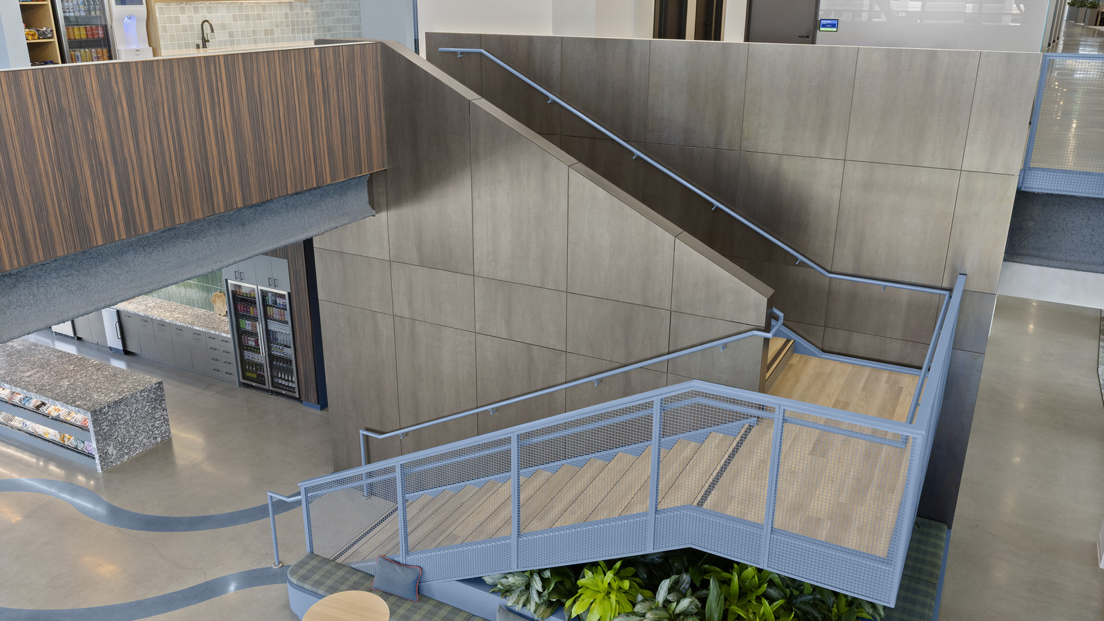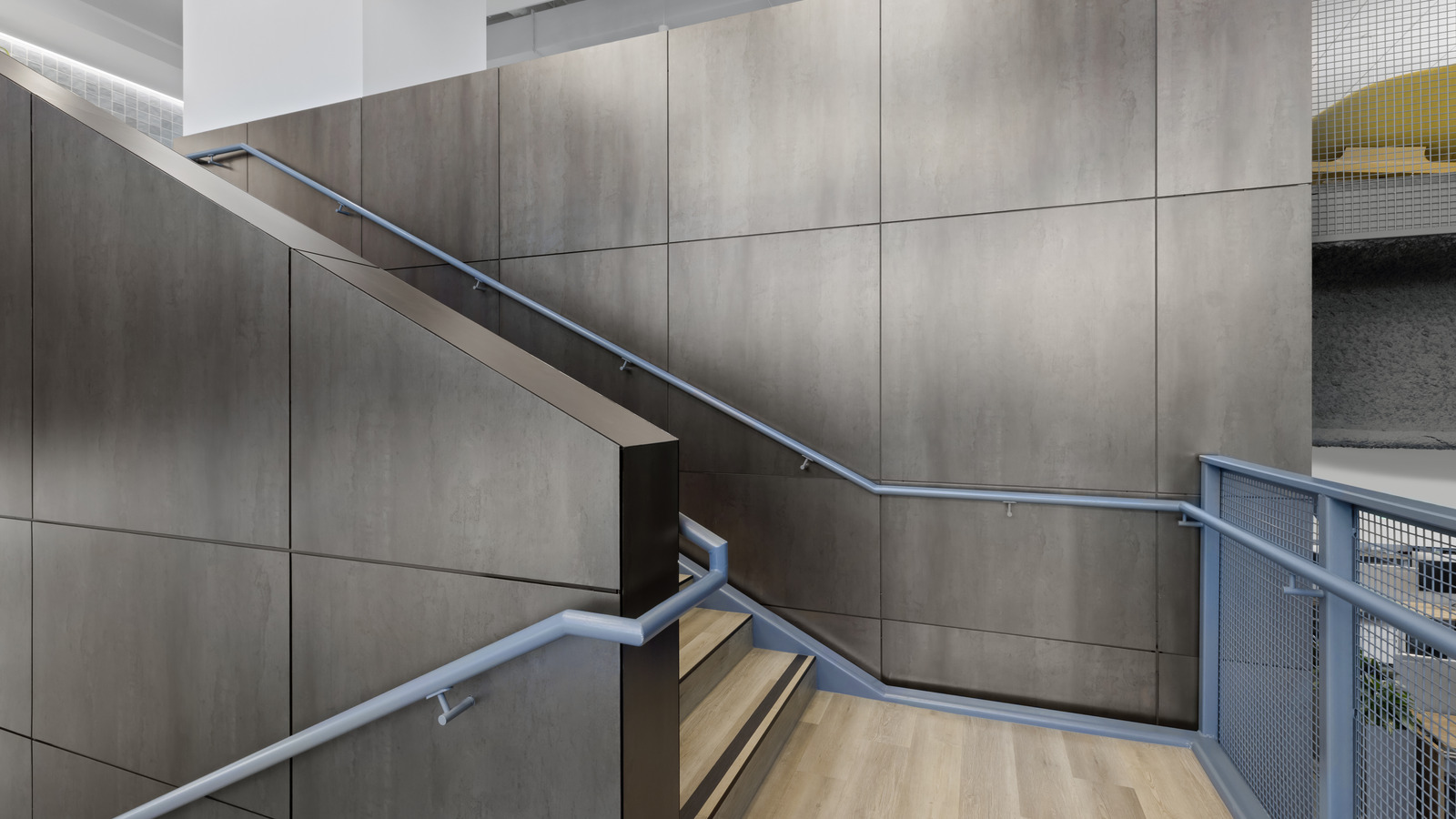 Moz Designs provided 170 Patina Flat Sheets, including 31 panels made from .125″ aluminum in a 4’×8′ size, for use as decorative wall cladding along a stairway in a tech workplace located in Bellevue, Washington. Our scope included providing the finished Patina material only, with all cutting, fabrication, and mounting completed by others.